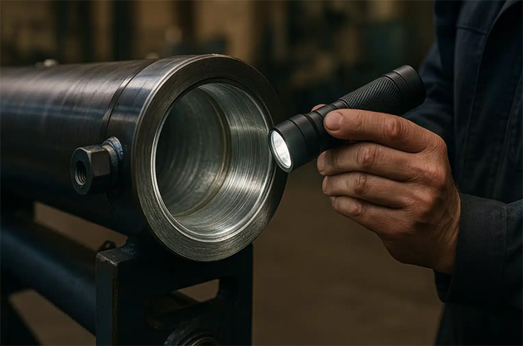 Lägg ett rent finger i cylindern och vidrör innerväggen för att kontrollera: alla skrapar djupare än 0,5 mm (ungefär tjockleken på en nagel) kommer att orsaka ihållande vätskekontamineringsproblem. Samtidigt observera om cylinderns innervägg har enhetliga fina sliplinjer. Om det finns ljusa fläckar eller spår kan det vara ett tecken på kolvskador. Innan du beställer reservdelar måste du först behärska metoden för att exakt mäta den hydrauliska cylindern.